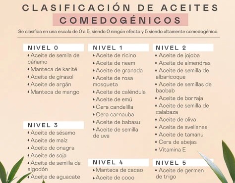 A continuación te dejo una tabla de los aceites comedogénicos según sus niveles: